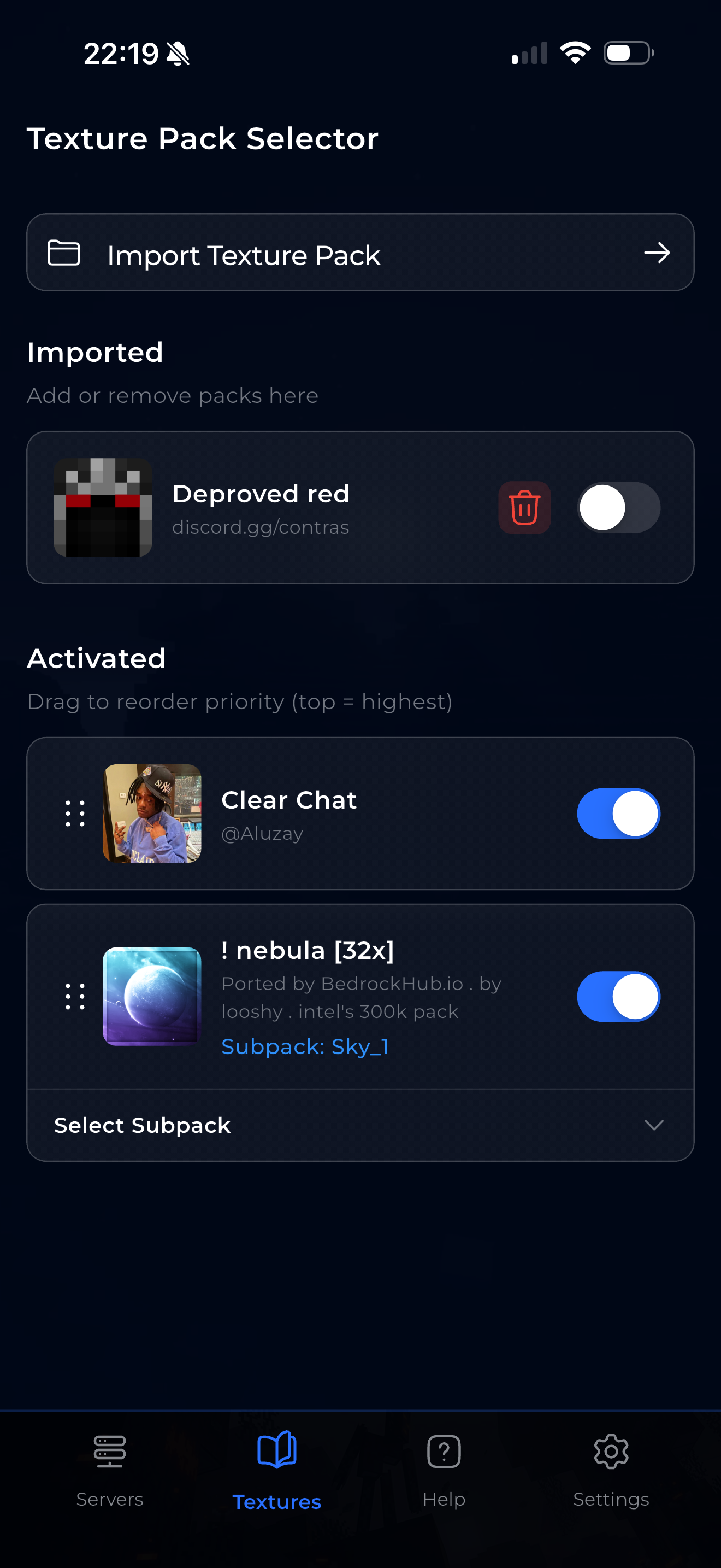Go to the Textures tab in the app. Tap "Import Texture Pack" to add a .zip or .mcpack file. Once imported, toggle it on to activate it.